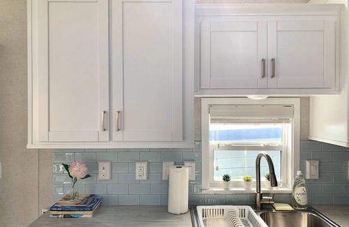 tastefully decorated, modern 2 bedroom/15 bathroom waterfront tiny house with dock for a boat. Outdoor area with large dining table, lounge chairs and grill to enjoy evenings under the patio lights.