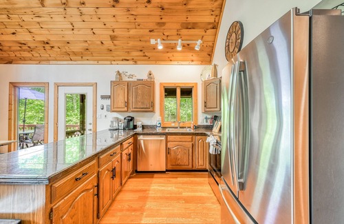 when you're not out exploring or cruising the lake, make the most of the home's two-acre, waterfront location by swimming and fishing from the private dock Anglers who bring their own gear and tackle can pick up bait from the nearby marina. Floats, paddleboards, and kayaks are also provided for added fun on the water. Multiple outdoor spaces include a sundeck and shaded patio complete with seating and lounge areas, plus a table for alfresco dining. At the end of the day, gather on the screened porch or take a soak in the private hot tub under the stars with a "treehouse" feel surrounded by woods.