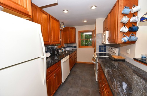 main level - open living area with wood burning stove, dining area and fully equipped kitchen with dishwasher, bedroom with full bed (sleeps 2) and 3/4 bathroom with shower