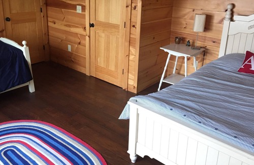 private waterfront with dock Open floor plan with large stone fireplace, dining farmtable overlooking the lake, master bedroom with queen bed/jacuzzi bath and 1/2 bath on 1st floor. 2nd bedroom with queen bed and twin, bunk room with 5 twins, including triple bunk bed and full bath occupy 2nd floor. Main cabin sleeps 10. Detached garage with living space above, kitchenette, full bath, queen bed and trundle, sleeps 4 total. Outside patio with seating overlooks heated pool and lakefront. Swim, kayak, paddle board, canoe, play games in the yard in this quiet, serene, beautiful cove. 4 kayaks, 2 paddle boards, a canoe and pedal boat included. Nighttime fire pit and s’mores by the water’s edge. Year round rental. Minutes from North Conway outlets, downtown, and Cranmore and Attitash. A perfect vacation spot for families! (Pool opens mid May- mid October).