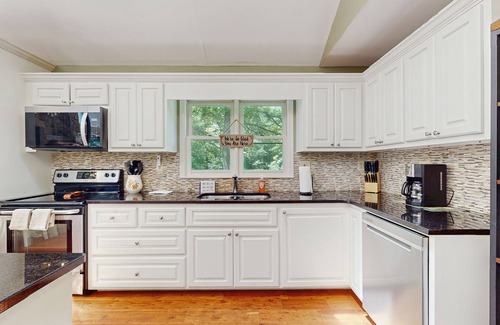 drop your bags in the expansive, open-concept living area to unwind beneath vaulted ceilings with a nice glass of wineThe deck is enormous and great for hosting get-togethers with friends and family. There's also a large flat yard with easy access to the creek, plenty of room for family games outside, and a screened-in gazebo and two benches where you and your loved ones can enjoy the sights and sounds of nature. But tonight, select a movie from the DVD library to enjoy with lots of salty snacks, courtesy of the full kitchen.