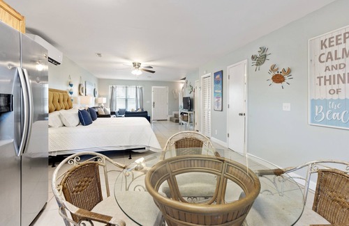 waterfront secret (2) is located one block from the beach on a serene lake front The ground floor living space features an open living, kitchen and dining area, along with 2 queen pullout couches and a twin bed tucked inside the entertainment area. There is also a full laundry room and bathroom. Upstairs is a king bedroom which shared a full sized hallway bathroom. Across the hall is the king apartment studio, equipped with a full kitchenette, and walkout balcony overlooking the pond. From the balcony you can catch a glimpse of the Emerald Coast as well.