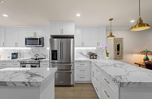 culinary enthusiasts will love the fully equipped kitchen, boasting top-tier appliances and expansive modern countertops with a central kitchen island, all designed to make your cooking creativity shine Then gather around the kitchen bar to share mouthwatering meals with your family and friends.