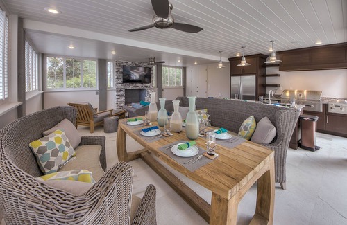 our property includes 600 square ft of indoor living space with an additional 1152 sq ft of furnished outdoor living space Outdoor living spaces include a full summer kitchen, dining area, 2 outdoor living rooms with each having its own large screen TV and fireplace.