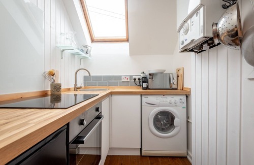 high ceiling with original beams, solid oak floors This light, airy wee space has a double bedroom area off the lounge, cleverly divided with bi-fold glass doors - check out all the photos! Separate room for kitchen with solid wooden worktops and Nespresso machine. A delightful, stylish space with modern, bright features.