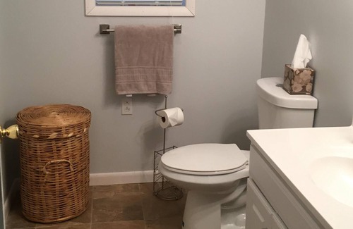 there are 2 bathrooms (1 upstairs; 1 downstairs), each with shower, and a full laundry room Home is full stocked with sheets, blankets, pillows, and towels.