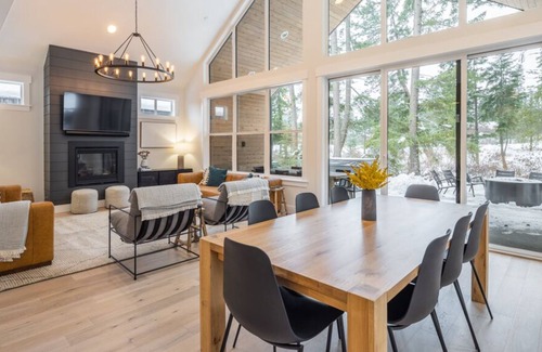 this cabin has a stunning free-flowing design from the kitchen, dining and living areas enhanced by large windows and a fireplace The dining area can seat eight people comfortably and the gourmet kitchen offers island seating for an additional three. The kitchen boasts all the stainless-steel appliances needed for a home-away-from-home experience.