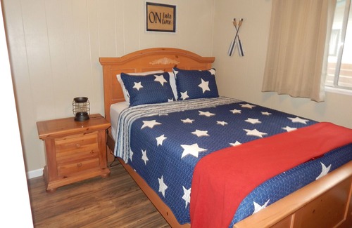 we have 2 well appointed bedrooms (1 queen, 2 twins) and one full bathroom with shower The living room has a loveseat, large chair and a futon for additional sleeping space, and a desk. The backyard has a covered deck with a small view of the lake and a table with umbrella, and is fully fenced for your furry friends (Add'l $40/night for pets). Relax on our front porch with a cup of coffee or play a game of corn hole or horseshoes in our shaded backyard. If you are a member of the Ski Lodge or a guest of a member, we are 50 yards from there, an easy walk. We offer free WiFi, and a BBQ grill with everything you need for grilling and a full kitchen to prepare your meals inside..