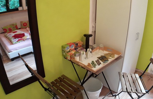 the equipment includes a kettle and various types of tea as well as coffee, capuccino, espresso and hot chocolate, a large full-length mirror and care products in your own bathroom, eg. B. Shampoo and conditioner, shower gel, soap, hand lotion and a hair dryer.