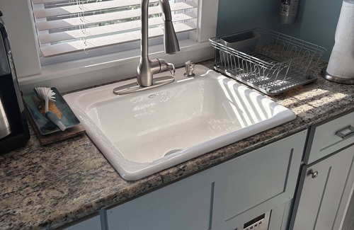 This 1920's cottage was renovated in 2016 and has all the modern features you could expect in such a small space. Choose to sleep on the American Leather pull-out sofa with king Memory Foam mattress or the other king-sized mattress up the stairs in the loft. Both AC and heat will keep the space at the temperature of your liking, with a ceiling fan providing multi-speed air circulation. Flat-screen TV with cable is available along with WiFi. The kitchen, with its generous granite countertop, is fully equipped with gas stove, microwave, and under-counter refrigerator. A foldaway table is available for quiet meals inside, but if weather permits, there is a large sunny eating area outside with both a large table and small bistro table for your use, with a tankless gas grill to boot.