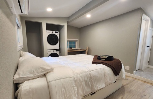 our newly renovated, open concept 1-bedroom, 1-bathroom rental comfortably accommodates 3 guests Park your cars or larger vehicles like campers/trailers right outside the front door, as we offer dedicated and free parking. There are power outlets to accommodate a 110v electric vehicle charger. Enjoy the convenience of your own laundry, dishwasher, and fully furnished kitchen.
