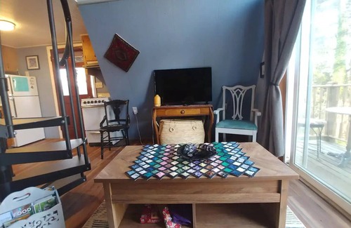 very quiet & private tiny house with shower in the bathroom Kitchen/living area with television (with Hulu, Netflix, Spotify and Amazon Prime), Wifi* and lovely balcony overlooking the trees. Full Size bed in the loft. It is accessible by both an outside staircase and an inside spiral staircase. The sofa is a full sized sleeper sofa downstairs.