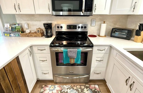 "Eagle’s Nest" is a 2 Bedroom/2 Full Bathroom, Wheelchair Accessible, chemical Fragrance Free and Medical Medium friendly! Newly Remodeled with brand new solid hickory hardwood flooring, soft close solid oak kitchen cabinets, white quartz kitchen counters, new bathroom tile and shower floor in master, built in wardrobes, fresh No VOC paint throughout, a new driftwood wreath and 2 new paintings.