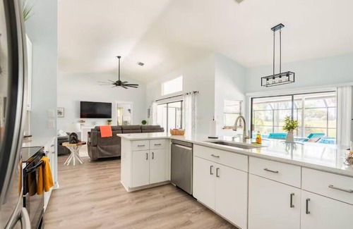 Escape to tranquility at Whispering Palms, an exquisite family retreat minutes from the beach. Indulge in luxury with three bedrooms featuring plush bedding, complemented by a heated pool and hot tub area with a golf course and lake view. Revel in the spacious layout, open floor plan, and a well-equipped kitchen. Your ultimate getaway awaits in this beautifully adorned haven.