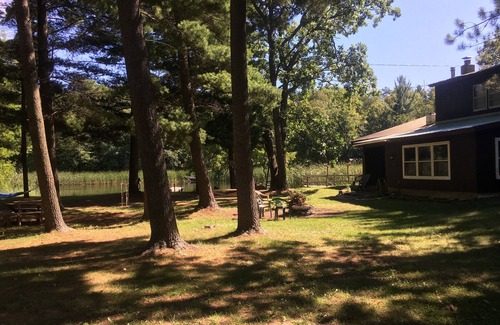 Enjoy peaceful getaway at end of the road hideaway. 8 acres, 3200sq' cabin, 5 bedrooms, master w/Cal king, 2 bedrooms with Queen , 1 bedroom with full, Upstairs with 4 singles, 2 bath. Dining rm seats 12+, full kitchen seats 6, laundry. Fire pits. Located on point, Lower Twin Lake on one side Shell River the other. Jet/Ski/boat/Canoe the beautiful river or lake, fishing is excellent, shack available. Surrounded by 5 State Parks/ hundreds of miles of hiking, biking, RV/snowmobile trails. Perfect for groups/reunions/employee getaways, hunters. Two canoes, 2 kayaks, paddle boat, Dingy, and fishing boat with oars included with rental..