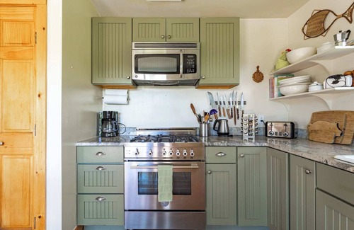 the cathedral-ceilinged living room and dining area offer a generous amount of space and comfortable seating (includes a pull out sofa), with the added coziness of a wood stove The living space flows into a new kitchen, with fab chunky chopping block island, again with glass doors leading out to the deck.