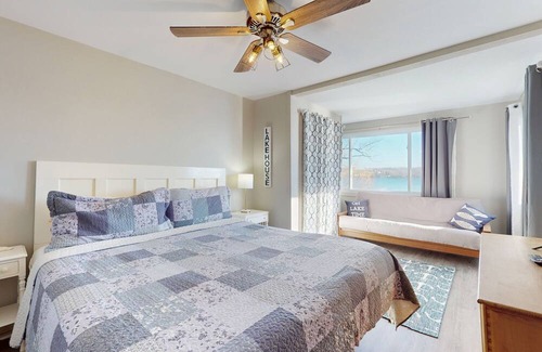 inside, this lakefront gem boasts a welcoming living room with marvelous lake views, comfortable sofas, and a 50-inch vizio smart tv so you can stay up to date with your favorite series during your time away from home The living room opens onto a private stretch of lake beach. When mealtime comes, prepare savory culinary masterpieces in the well-appointed kitchen. Coffee enthusiasts will love having a Keurig coffee maker available. The first floor also houses a full bathroom and a laundry area with a washer/dryer. The upper level enjoys all three bedrooms. The primary suite has a 32-inch TCL TV and a nice sofa with breathtaking lake views. Additional on-site perks include an electric fireplace, board games, books, children's toys and games, AC units, dog bowls, dog towels, and dog bags.
