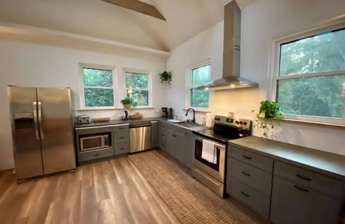 this space is remote work friendly, equipped with two desks and high-speed wifi Mature gardens surround the house, fostering a cozy, private environment. The outdoor patio provides the ideal ambiance for relaxed outdoor dinning. Designed, built and styled by a West Coast couple, we've poured our hearts into creating a truly soothing place to unwind. Our historic neighborhood is quiet and family friendly. We expect guests to respect the quiet hours. This is not the space for parties or loud groups. We allow 1 pet to join you. Please list your pet as part of the reservation. We own a friendly Labrador and need to be aware of other animals that will be on the property. A small pet fee will be charged to cover additional cleaning costs associated..