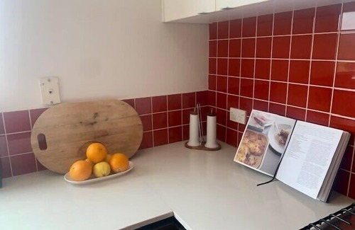 the kitchen comes with a full-size fridge, under bench oven, 4-burner gas cooktop and a dishwasher, with a red-tiled splashback adding style and colour
