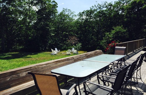 Beautiful, large and comfortable Cape farmhouse on 8.8 acres in exclusive Edgartown location on the Great Pond. Walk down a private path to the Edgartown Great Pond, known for being one of the most pristine and beautiful natural areas of the island with access to a secluded area on South Shore Beach. Kayak from property along 5 miles of shoreline or down to the Atlantic. Also enjoy miles of bike paths at the end of the road. Take a short bike ride to Morning Glory Farm for locally grown fresh fruits and vegetables or ride two miles along beautiful, flat bike paths to Edgartown center. At home, families will enjoy the large patio and lawn area for barbeques, picnics and relaxation. Central A/C. This wonderful home accommodates extended families with multiple living spaces. The large tract of land surrounding the house with acres of lawns assures privacy and quiet for vacationing families. The main level of the 3,720 sf farmhouse has an open plan kitchen with lots of elbowroom for the enthusiastic cook. The kitchen connects to a spacious dining area with wide-board pine floors. The living room has a cozy wood-burning fireplace and an adjoining den/study that can be closed off with sliding pocket doors. The large master bedroom suite on the main floor has vaulted wood ceiling, pine floors, wood-burning fireplace, walk-in closet and a large private bath. The second story has 4 large bedrooms, (3 with a king bed and 1 with 2 twin beds) and two bathrooms. On the main floor, there is an additional bedroom/play room with 2 twin beds. The basement has an additional bathroom with shower, pool table, air hockey, foosball, ping pong, PS3, PS4, TV , exercise bike and an elliptical machine. Rental includes use of beach chairs and umbrellas, tennis rackets, etc..