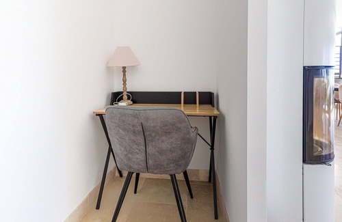 this 6-room villa spans an impressive 240 square meters and boasts a south-facing position, ensuring ample natural light throughout the day The comfortable and modern furnishings create an inviting ambiance, with a spacious living/dining area that features a TV and a cozy wood-burning stove. The living area seamlessly transitions to a terrace, allowing you to step outside and enjoy the fresh air. On the main floor, you'll find a bedroom with a French bed measuring 160 cm x 200 cm, also offering direct access to the terrace. The well-equipped kitchen includes an oven, dishwasher, induction hot plates, toaster, kettle, microwave, and an electric coffee machine, ensuring you have all the necessary amenities for a delightful culinary experience. The kitchen also leads out to the terrace and swimming pool area.
