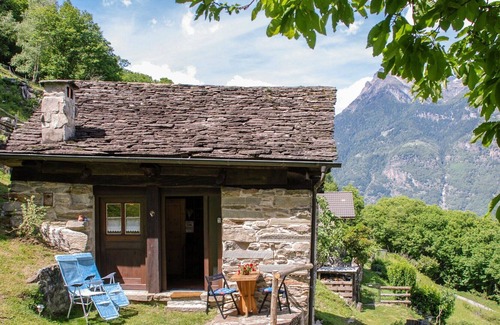 "rustico fey", 2-room cottage 50 m2 on 2 levels, south facing position Comfortable and cosy furnishings: open living/dining room with open-hearth fireplace, dining table and TV (flat screen), radio. 1 room with 2 beds (90 cm, length 200 cm). Open kitchen (3 hot plates, oven, electric coffee machine, combination microwave) with bar and wood-burning stove. Exit to the patio. On the lower ground floor: (steep stair). Shower/WC. Terrace furniture, barbecue (portable), deck chairs (2). Marvellous panoramic view of the mountains, the valley and the countryside. Facilities: children's high chair, baby cot for up to 2 year olds (extra), hair dryer. Please note: non-smoking house. Maximum 1 small pet/ dog allowed. Fire extinguisher. The kitchen is gas-fired. There is also a wood stove with oven for cooking. >>Note: The use of the access road to Monti di Ludiano has become subject to a fee as follows: CHF 10.00/day CHF 20.00/week. The fee can be paid in cash CHF and credit card. nl-00003747