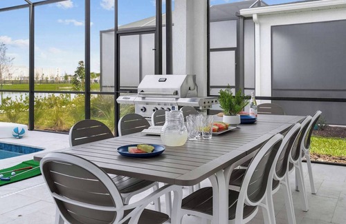 when the weather is right (basically always), pop open the patio door to your private outdoor oasis, featuring a crystal blue pool, comfy loungers, a patio table and chairs, and a grill shift the vibe from chilled to fired up with some friendly competition at the ping pong table, putting green, and poolside basketball hoop!