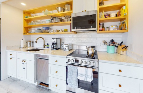 inside, downtime will be a dream with the exposed ceilings, white paint creating an airy ambiance, and an open layout that perfectly combines the living area, full kitchen, and dining area together for mingling with ease Speaking of the full kitchen, no recipe will be too complex, as the chef of the group will love taking advantage of the stainless steel appliances and modern cookware provided. plus, entertainment will be easy to find come nightfall with free wifi and streaming capabilities on the flatscreen tv!