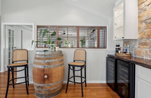 the top floor of woolgoolga lake house has a vast open plan layout, earthy touches, and a comfortable outdoor entertaining to enjoy your holiday Designed for couples and families alike, Woolgoolga Lake House is an ideal setting for intimate gatherings, family vacations, or a getaway with friends. The entertainer's kitchen is a culinary delight, making meal prep a joy.
