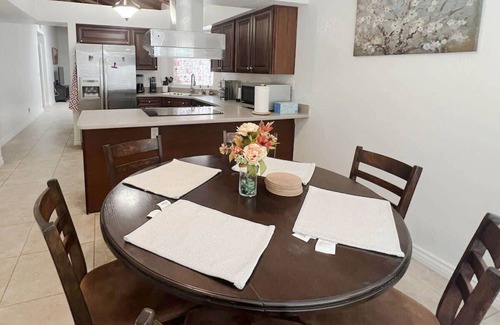 you'll have the entire home to yourself during your stay, including 3 bedrooms, 2 bathrooms, and a 2-car garage, providing plenty of space and storage for you and your family As you enter the home, you'll be greeted by a spacious living room with tall ceilings and plenty of natural light. The open floor plan flows seamlessly into the dining room and kitchen, which features modern appliances and plenty of cabinetry.