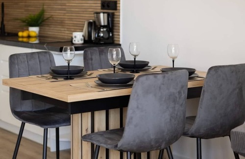 this modern apartment in warsaw offers comfortable accommodation for 4 people, making it an excellent choice for a stay in the capital with family or friends! the living space consists of a bright living room with a sofa bed, a well-equipped kitchenette, a cozy bedroom, and a bathroom with a shower The apartment is designed to ensure maximum comfort. Natural light fills the interior, creating a pleasant atmosphere. The stylish interior in trendy colors adds elegance to the apartment. The living room opens onto a small balcony, which is an additional asset. The fully equipped kitchenette allows for easy meal preparation, and the living room with a comfortable table and chairs is ideal for shared meals and gatherings. Guests can enjoy modern multimedia amenities such as a Smart TV and free Wi-Fi. The bedroom features a comfortable double bed, ensuring a restful sleep. Additionally, the apartment offers basic amenities such as toiletries, towels, and bed linen. For the convenience of guests, a private parking space in the garage is available, which is particularly valuable in the capital. The apartment is also pet-friendly, so we welcome guests traveling with their pets.