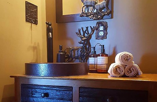 this is a nicely furnished rustic cabin with plenty of furniture and art pieces hand made by a local artist The cabin features two main rooms, kitchen, and a separate bathroom.