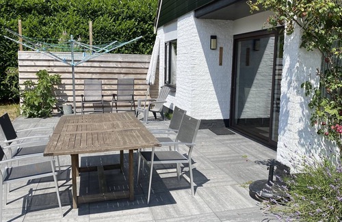 de garden faces south and offers lots of privacy On the terrace with the outdoor fireplace, which is placed on the terrace during the summer months and can be accessed directly from the living room, you can enjoy outdoor living without worries. The enclosed garden with a trampoline and sandpit make your stay also very pleasant with children and your beloved dog. Moreover, the park offers playing areas. You’ll find a parking at the house.