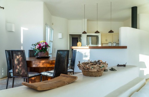 it consists of five en-suite bedrooms (one master suite), a spacious and super luminous living room with an attached fully equipped kitchen, while numerous openings offer direct access to the large terraced area and the long pool that embraces the whole building One of the bedrooms may be used for any staff that guests would like to bring and there is a also a laundry room..