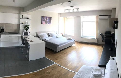 A bright, cozy and spacious studio apartment located in a new building with elevator, surveillance cameras and free parking in Luceafarul Residential Area near Ramada Hotel (200m) and close to the airport (4km).